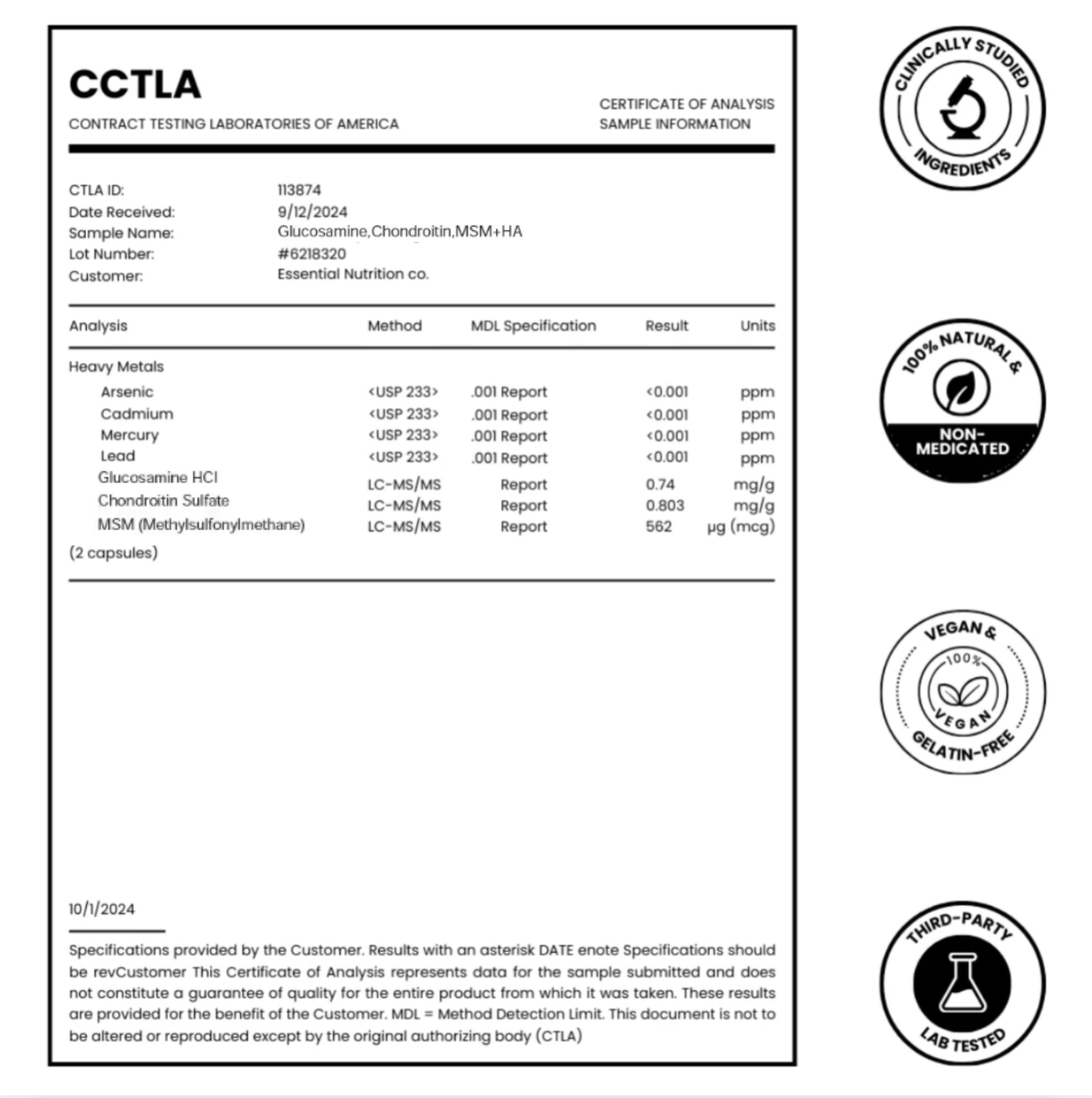 Unlike typical joint supplements that only claim to be “lab tested,” Vytal proves it. You can view the full CCTLA Certificate of Analysis in the 4th product image above